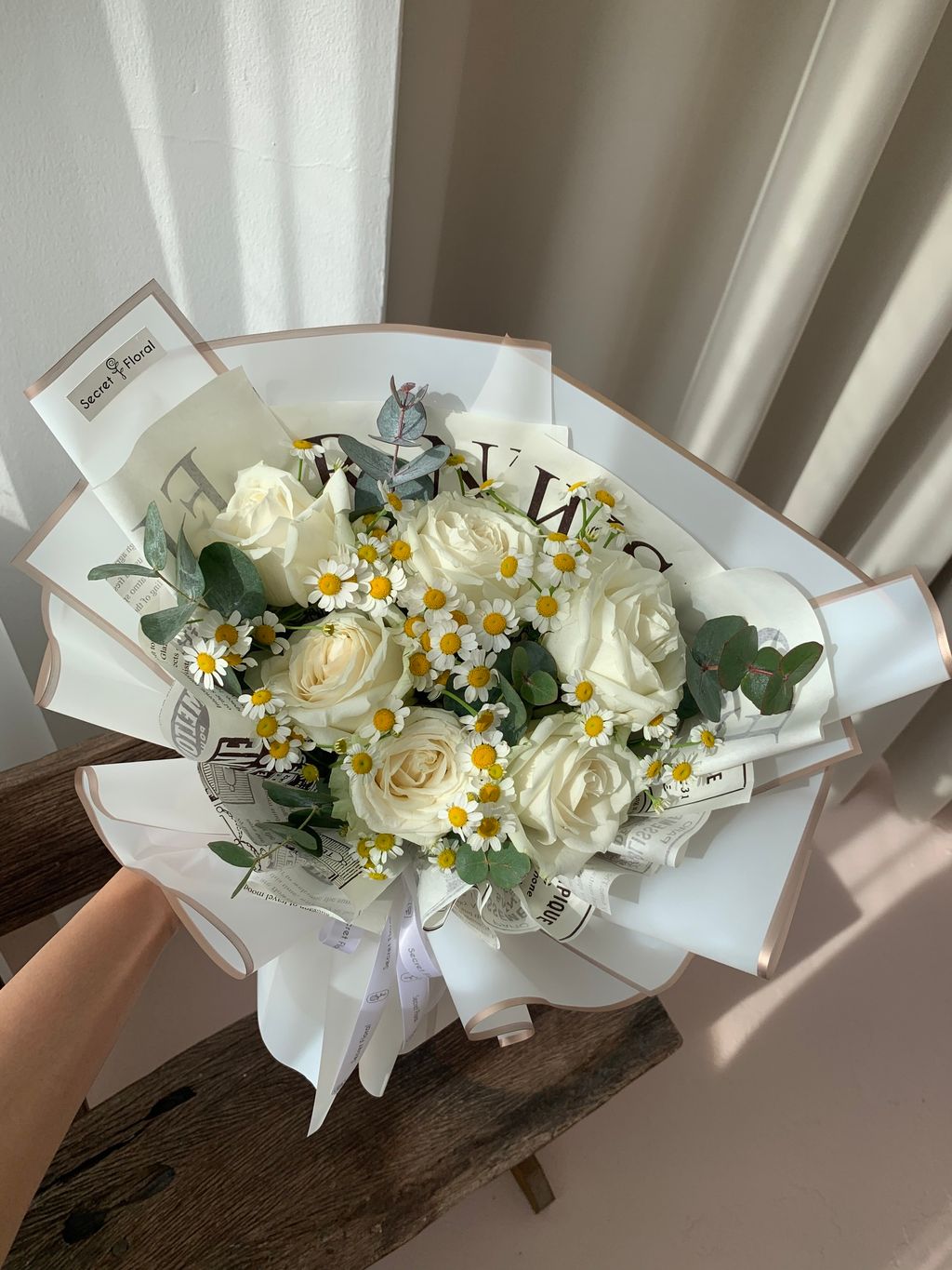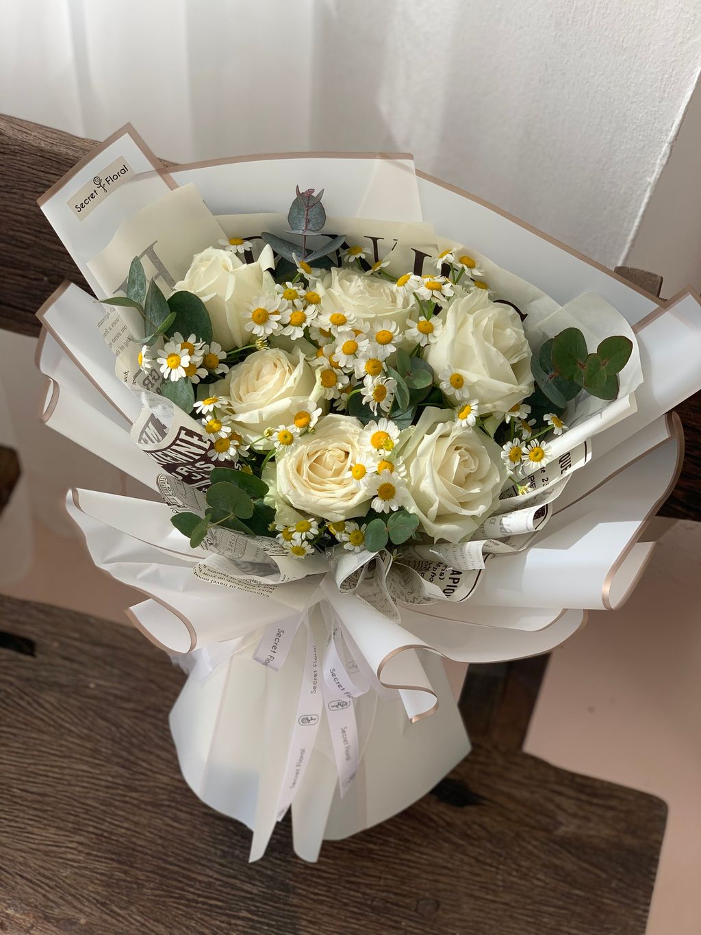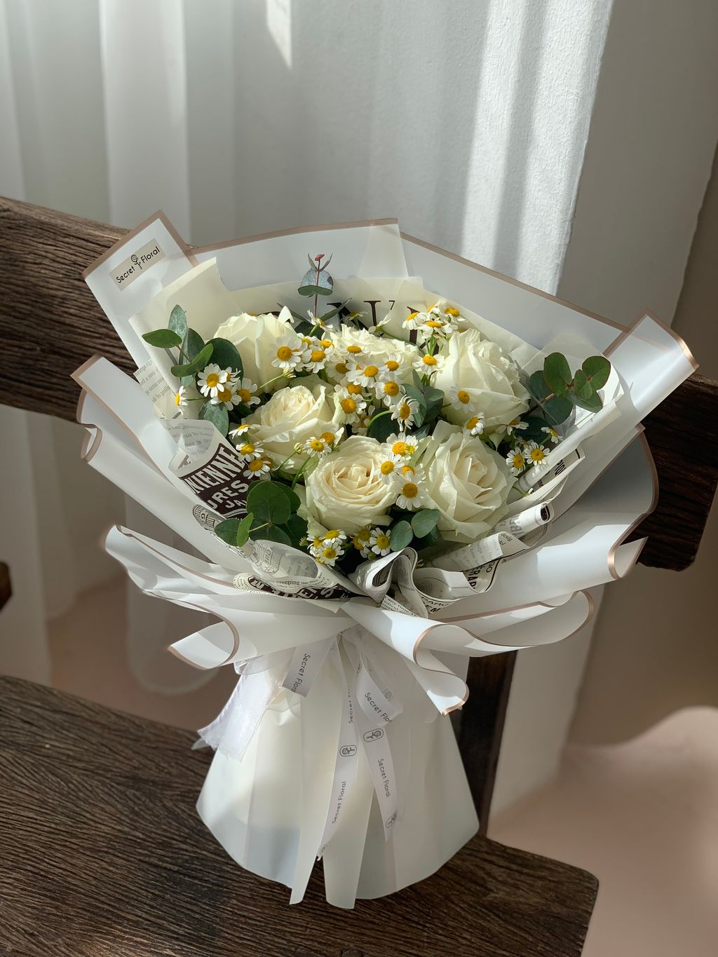 This bouquet features 6 stalks fresh white rose, chamomile, and eucalyptus
