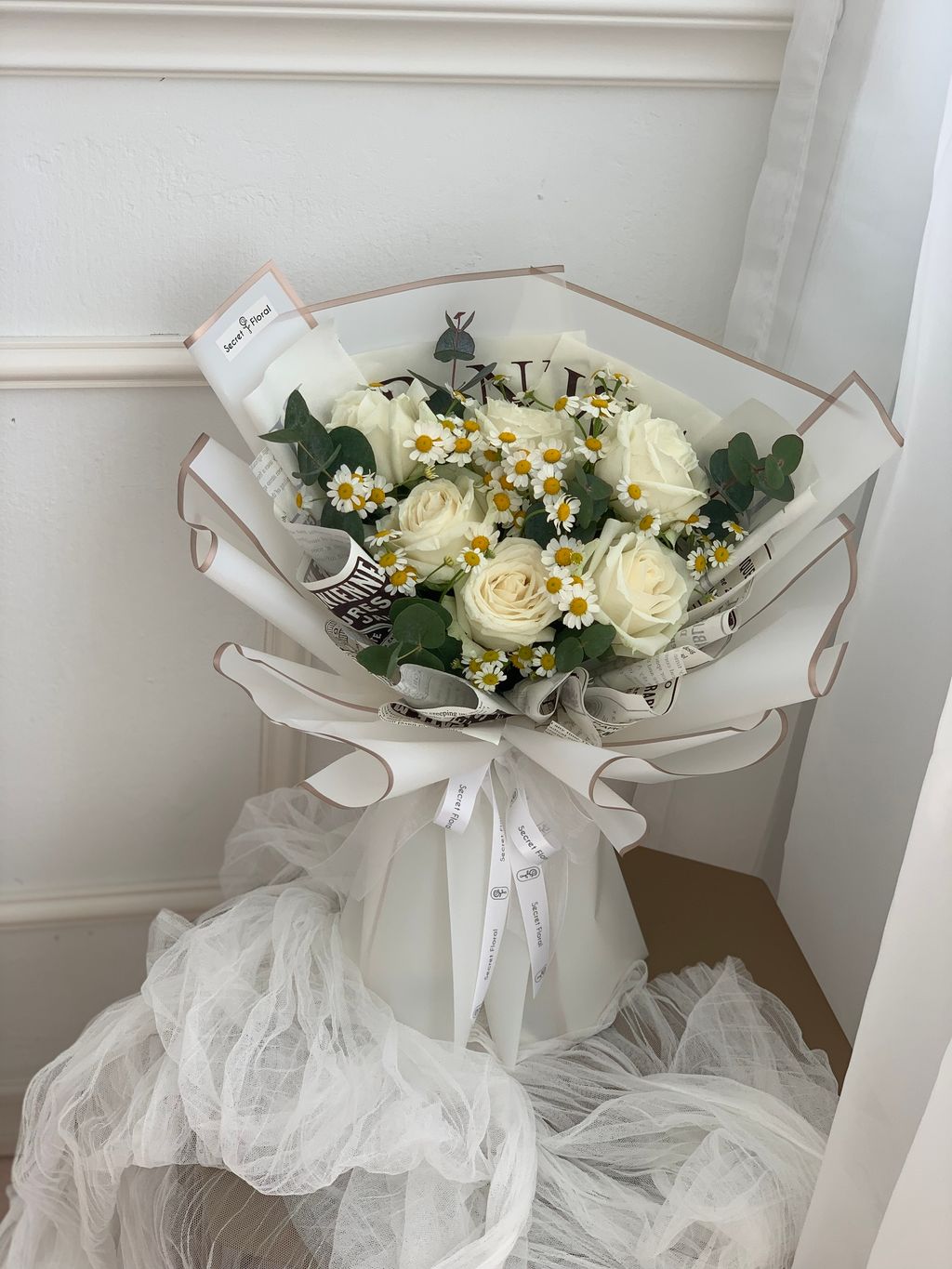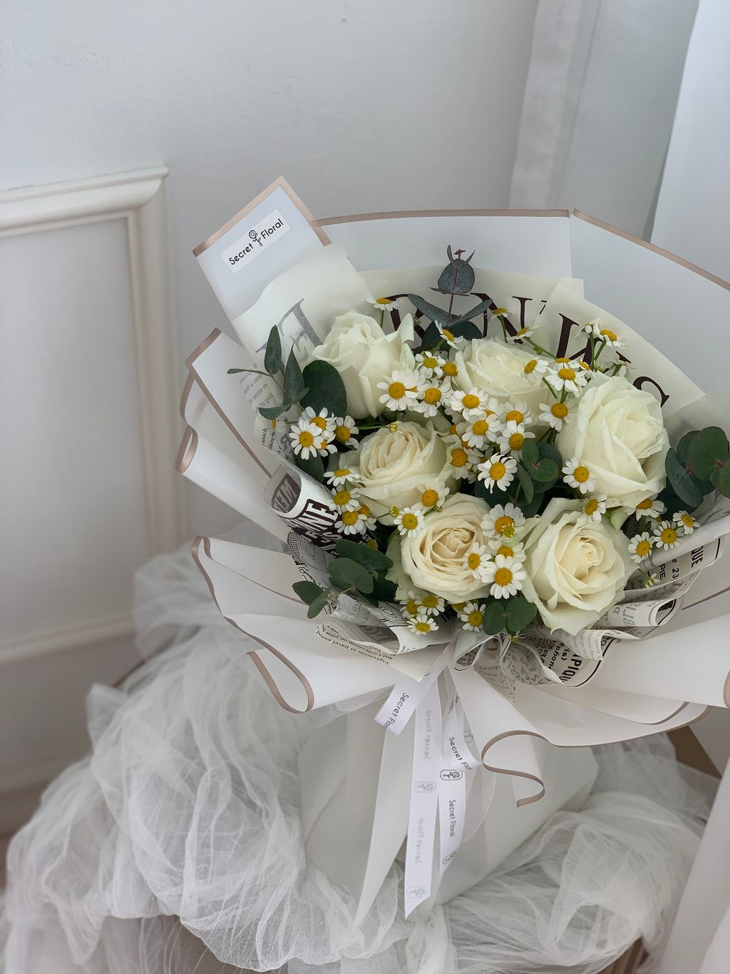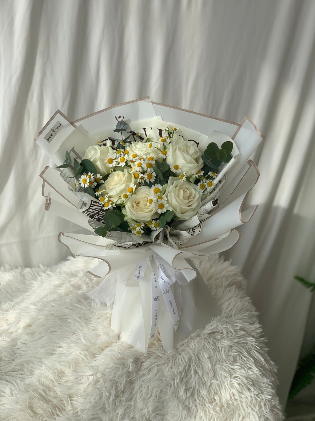 This bouquet features 6 stalks fresh white rose, chamomile, and eucalyptus